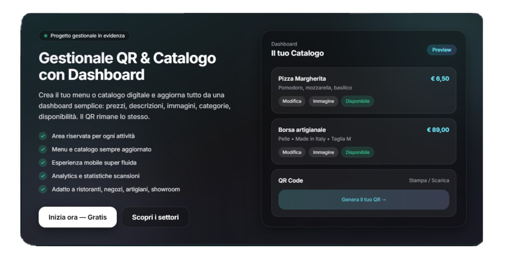 Create, manage and share your menu or catalog in minutes. QR code personalizzati, analytics in tempo reale, , intuitive dashboard. For restaurants, shops, artisans and any business.